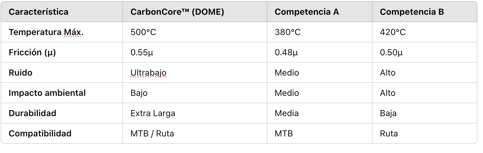 Cuando se trata de rendimiento en el frenado, no hay margen para compromisos. En DOME, hemos desarrollado el compuesto CarbonCore™, un material exclusivo que redefine los estándares de calidad y eficacia en las pastillas de freno para bicicletas. Nuestra tecnología avanzada supera a cualquier otro compuesto en el mercado, ofreciendo una experiencia de frenado incomparable en cualquier condición.